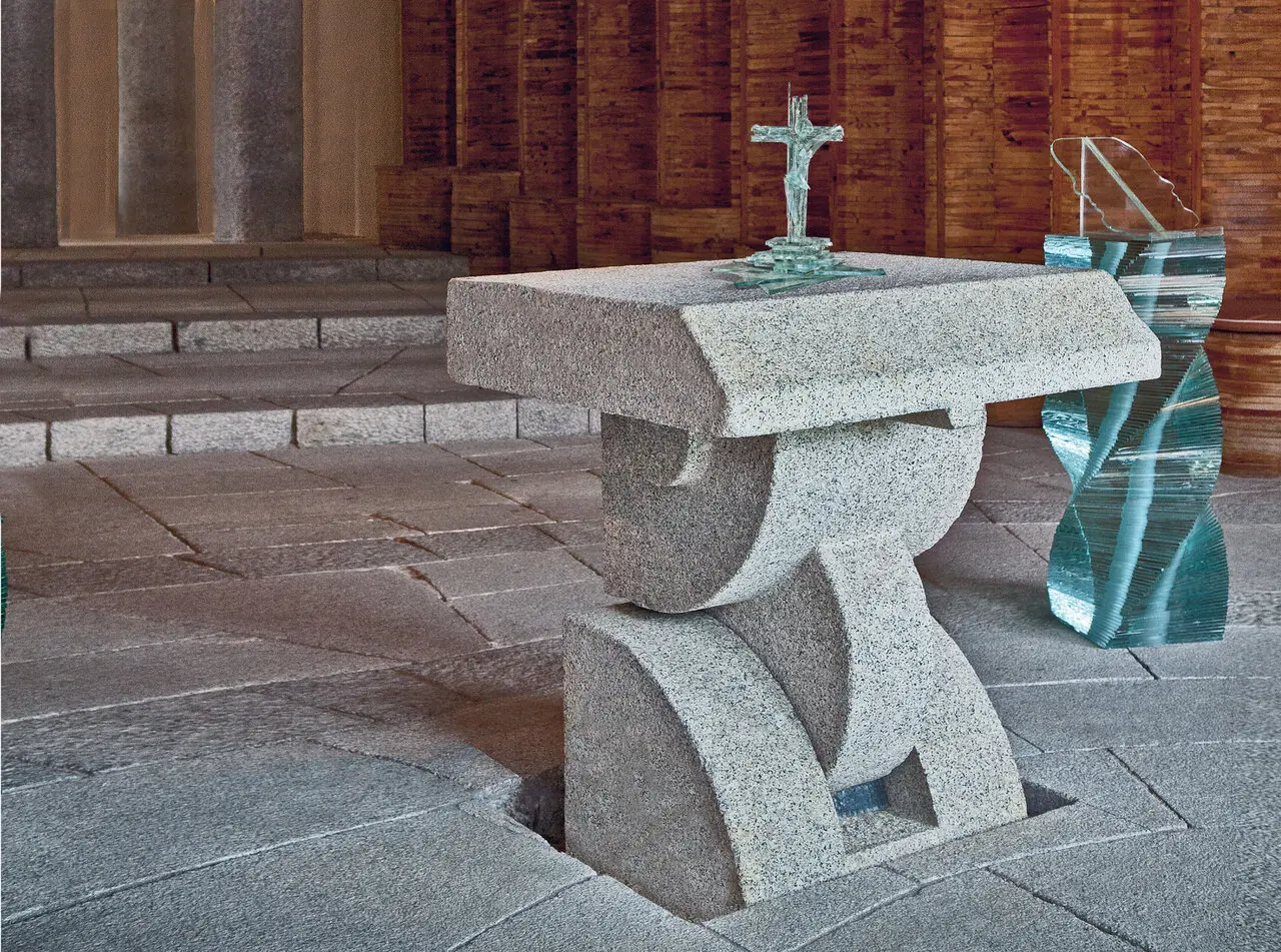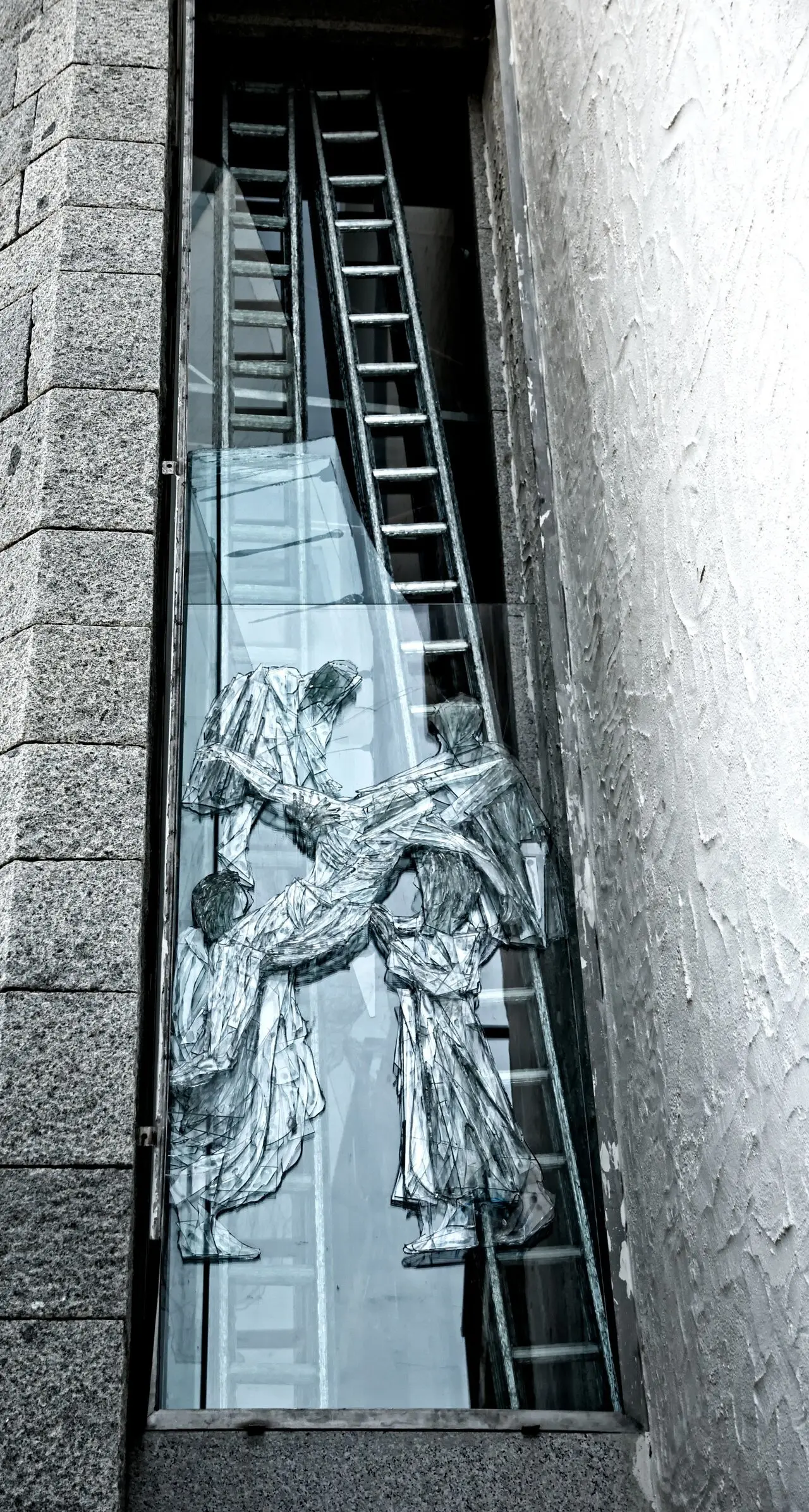 A chi crede che il vetro sia un materiale fragile e non durevole, consigliamo di toccare con mano le mille lastre del portone d’ingresso, e di alzare lo sguardo verso la Deposizione del Cristo dalla croce.
