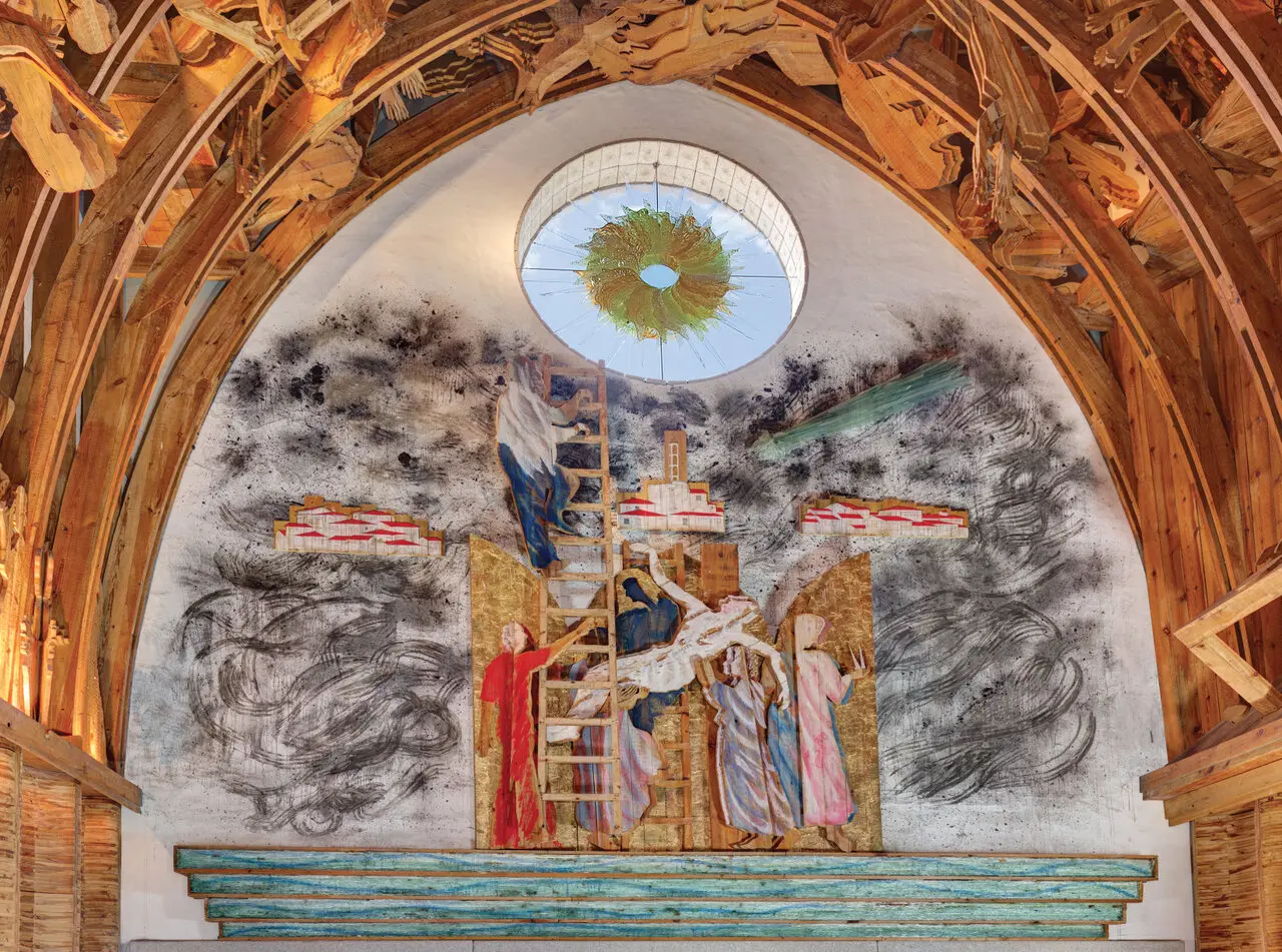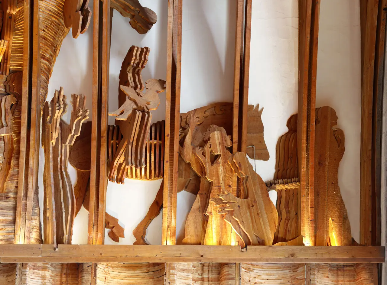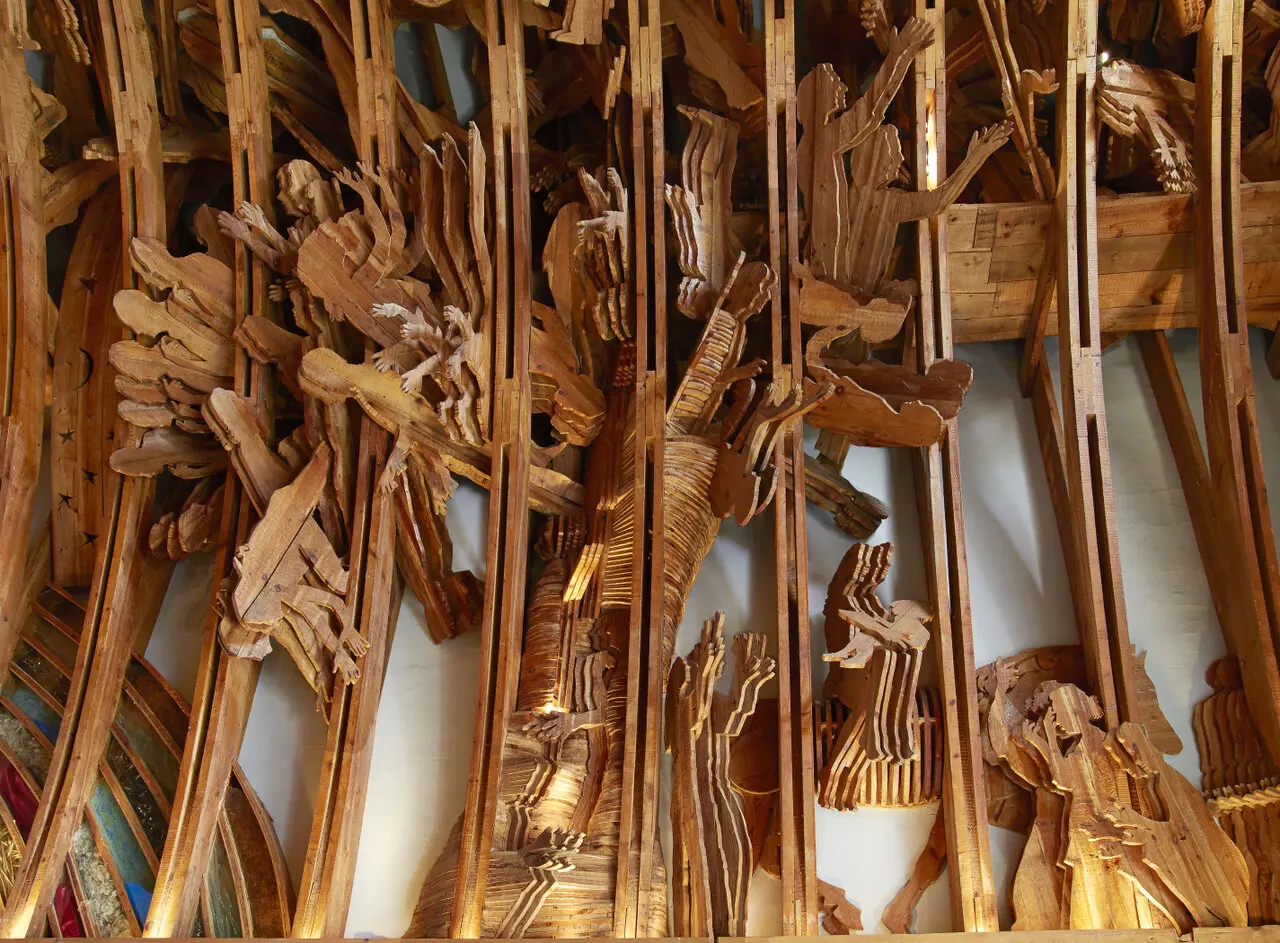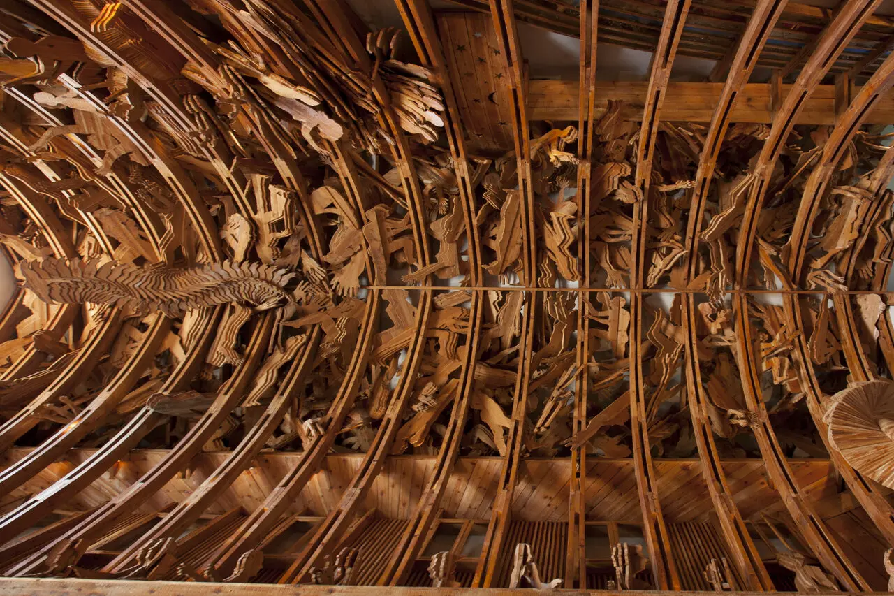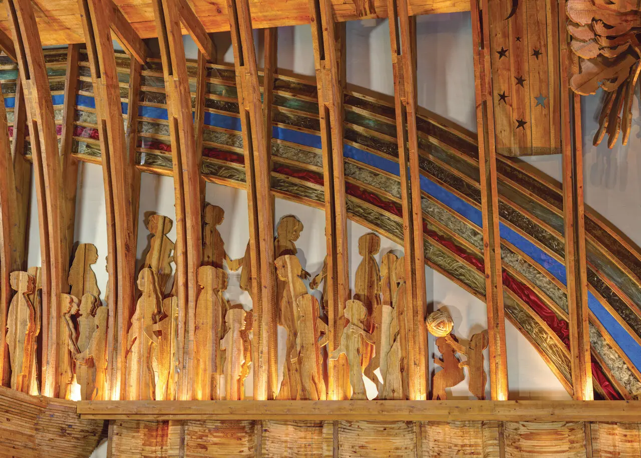 Lo sguardo si perde nella contemplazione delle migliaia di figure, realizzate in legno di pino di Russia, opere dello scultore Mario Ceroli, fissate nel loro eterno volo di anime: sono tutti profili di persone reali, e molti di loro si riconoscono a prima vista. Incastonato tra le capriate della volta, un caleidoscopio di profili di tutte le età, dal simbolismo a volte chiaro a volte criptico. Per emozionarsi ancora, cercare, sempre tra le creature in legno, la “fuga in Egitto” e l’Albero della Vita”.